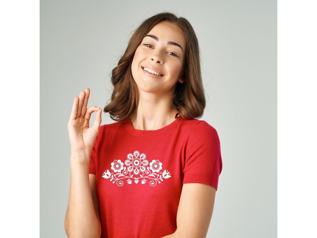 Vtipné tričko s potlačou ľudového vzoru je ideálny darček pre všetky milovníčky slovenských vzorov na" ľudovú nôtu"
